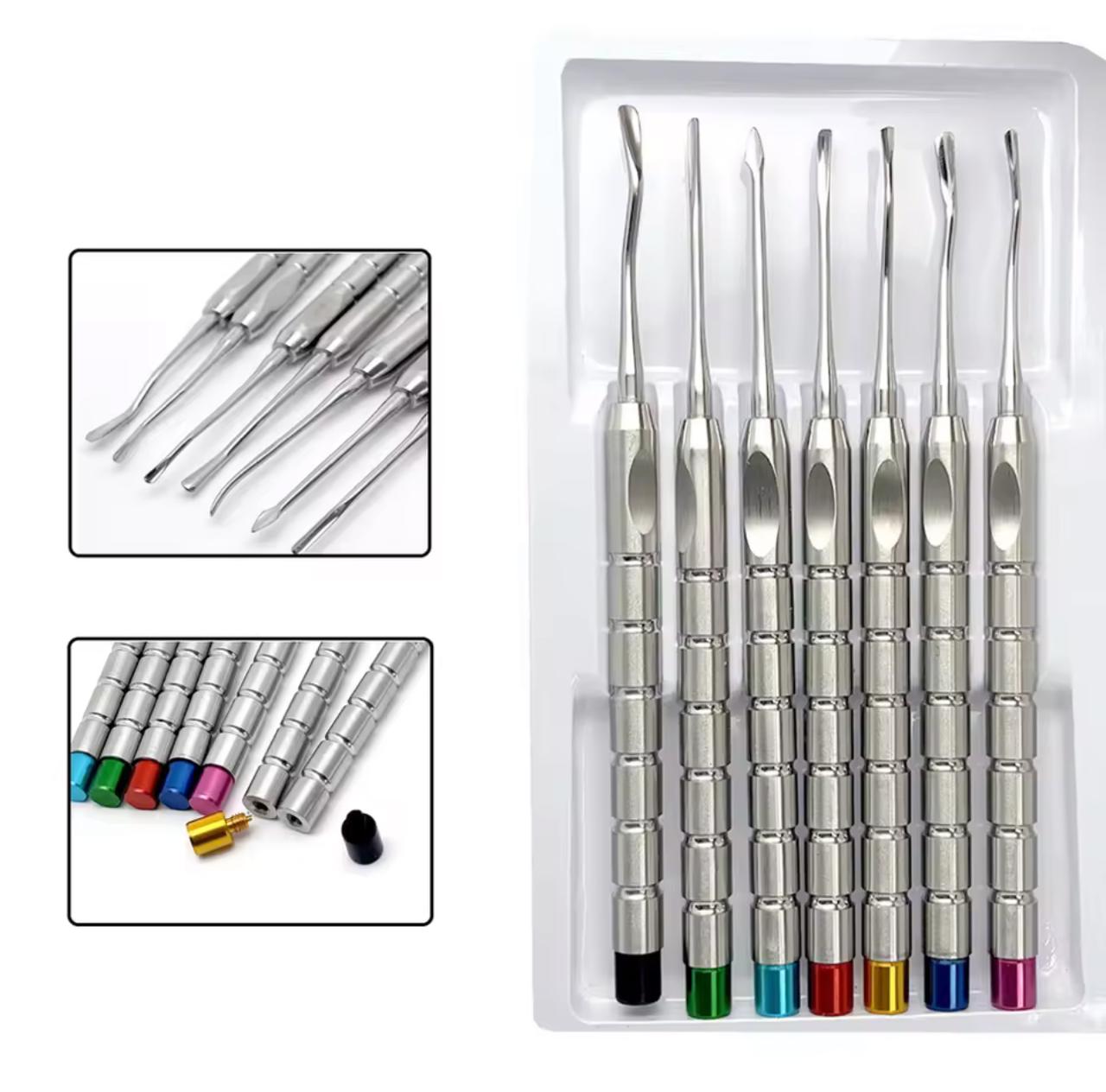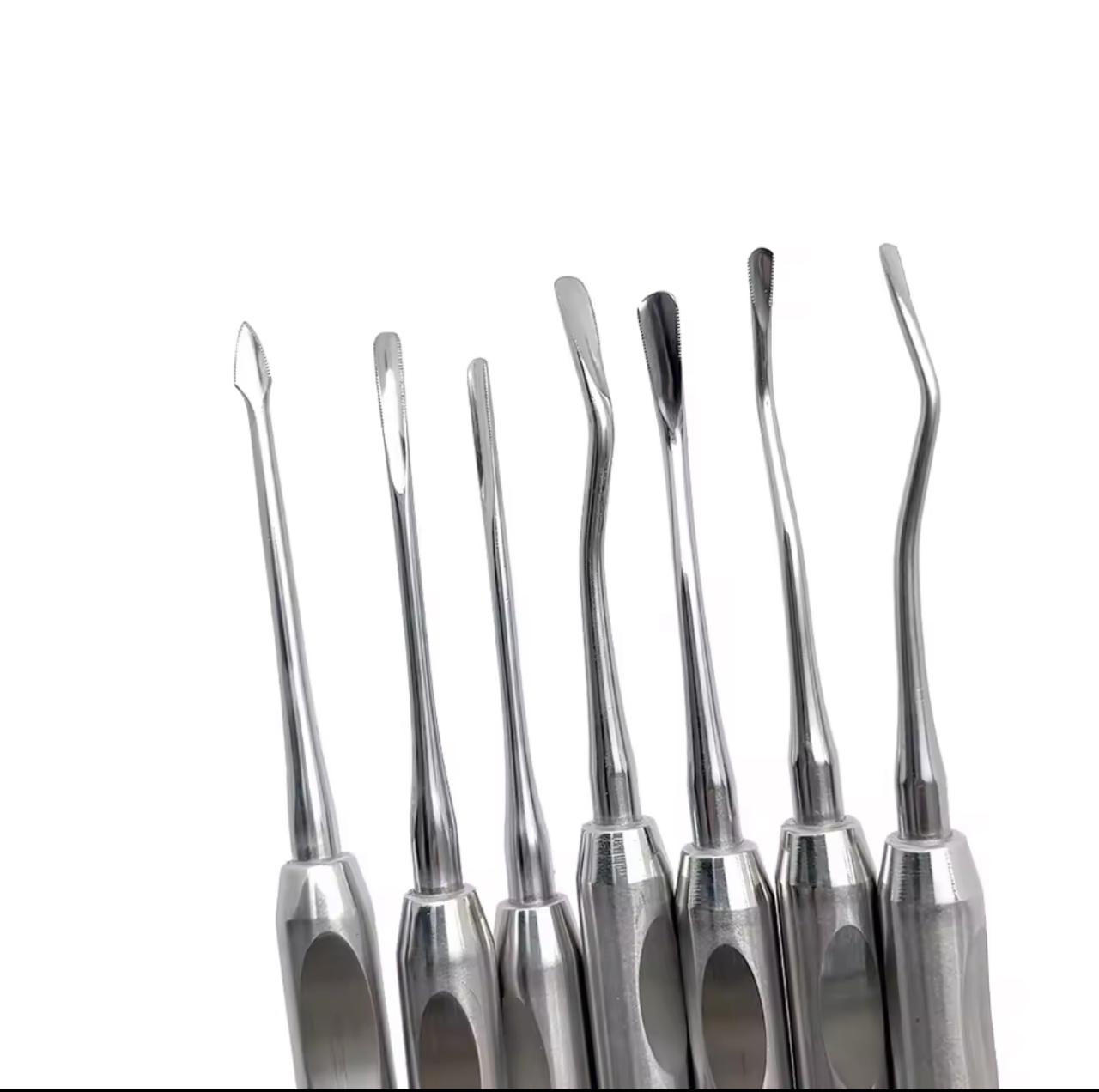 The kit includes XO-10, XO-20, XO-30, XO-40, XO-50, XO-60, XO-77, and Sterlizaiton Cassette. The X-Otome is a hybrid, a cross between the periotome and a root elevator. Severing the PDL and creating space along the mesio distal plane is executed with precision and acuuracy, due to the thin honed ends. The tips preserve tissue structures & eliminate bone fracturing. The custom grip handle has a thumb rest for even power transfer of hand pressure. Also used to remove roots and root fragments, the X-Otomes are made in the USA out of 100% stainless steel.